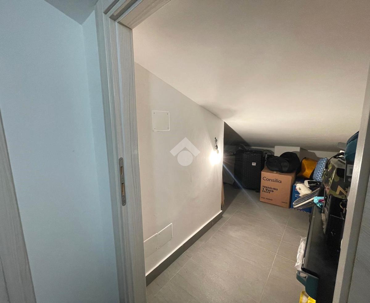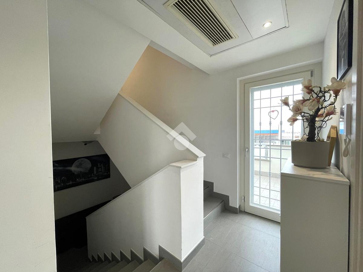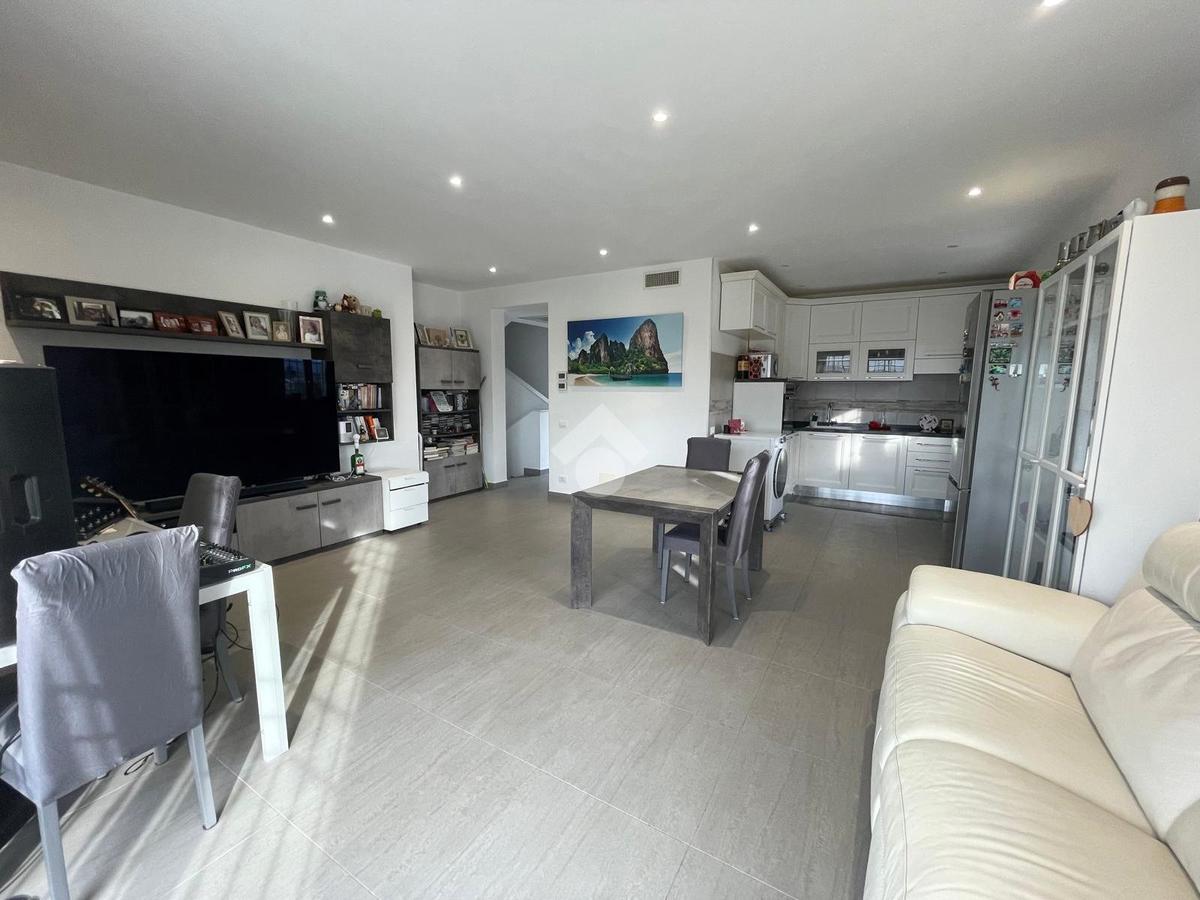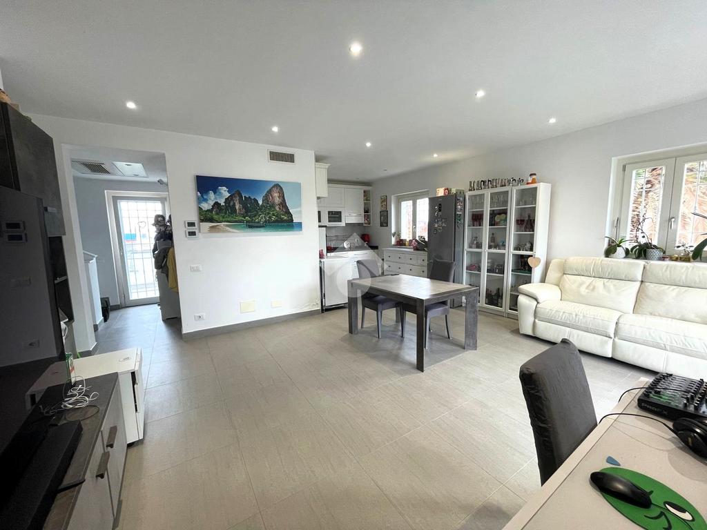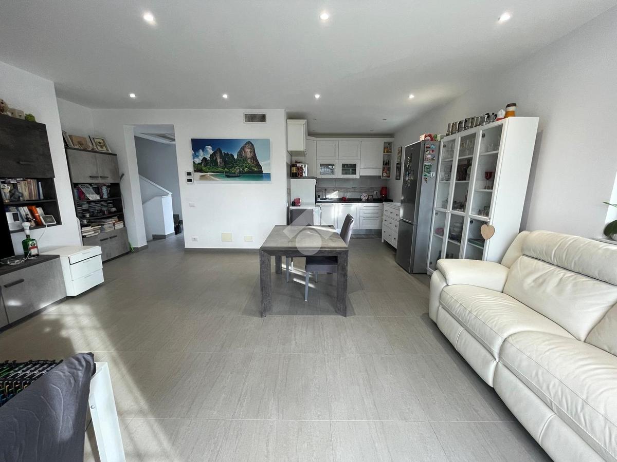 Primo livello: ampio e luminoso soggiorno con cucina a vista, tripla esposizione con affaccio su due terrazzi abitabili, bagno finestrato con box doccia.
